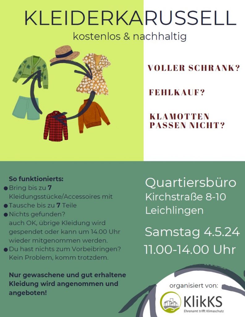 Am 4. Mai 2024 fand im Quartierbüro Leichlingen der erste Kleiderkarussell statt – und es war ein voller Erfolg! Zahlreiche Teilnehmende brachten ihre gut erhaltenen Kleidungsstücke mit und tauschten sie gegen neue Schätze. Das Event bot eine tolle Gelegenheit, um den eigenen Kleiderschrank zu sortieren, Fehlkäufe loszuwerden und gleichzeitig etwas Gutes für die Umwelt zu tun.